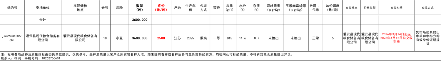 中標(biāo)方成交后將貨款匯至交易市場賬戶(與保證金賬戶一致)并申請出庫單,憑市場出庫單和身份證明到委托方指定庫點提貨,交割完成后雙方憑雙方確認(rèn)單到交易市場退保證金(保證金不沖抵貨款,待合同履約結(jié)束后統(tǒng)一釋放)。交款及交割期限為2026年3月14日起至2026年4月12日前交收完畢前,出庫事宜按相關(guān)規(guī)定執(zhí)行,買受人應(yīng)提前與委托方取得聯(lián)系,由買賣雙方協(xié)商確定具體提貨時間。中標(biāo)方每開啟一個倉,須在30日內(nèi)完成全部出庫,出庫事宜亦按相關(guān)規(guī)定執(zhí)行。