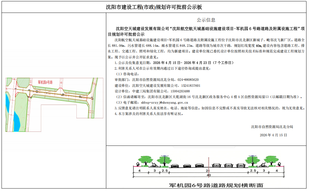 沈陽航空航天城基礎設施建設項目-軍機園6號路道路及附屬設施工程位于沈陽市沈北新區(qū)新城子,毗鄰沈飛新廠區(qū)。道路全長881.06m,污水管道長688.14m,雨水管道長848.23m,道路等級為城市次干路,規(guī)劃紅線寬度40m,建設內(nèi)容包含道路工程、排水工程、交通工程、照明和綠化工程,均為新建項目。建設單位現(xiàn)已委托設計單位按照相關技術標準和規(guī)范完成建設工程規(guī)劃方案。現(xiàn)予以公示并公開征求意見。