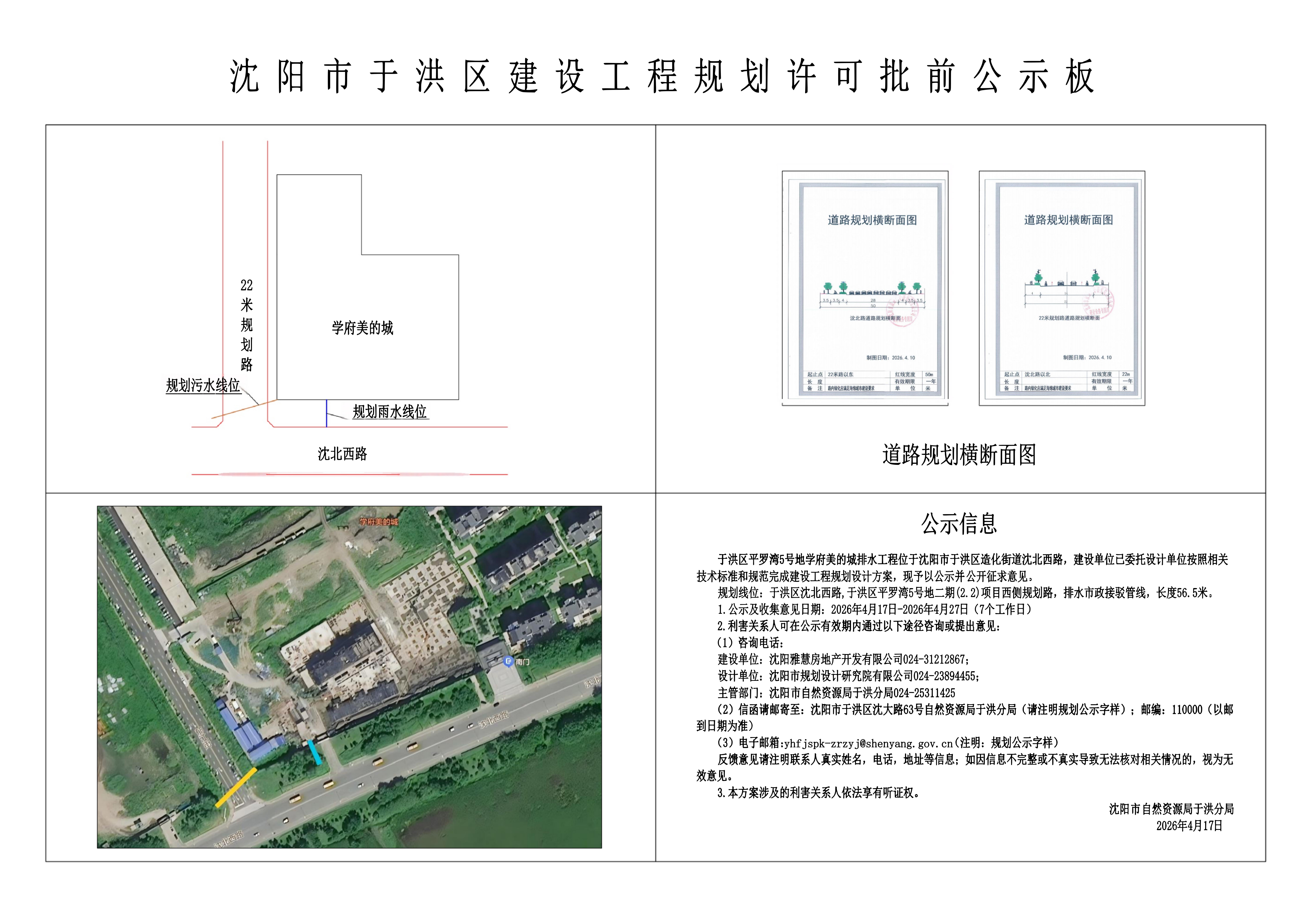 規(guī)劃線位:于洪區(qū)沈北西路,于洪區(qū)平羅灣5號地二期(2.2)項目西側(cè)規(guī)劃路,排水市政接駁管線,長度56.5米。