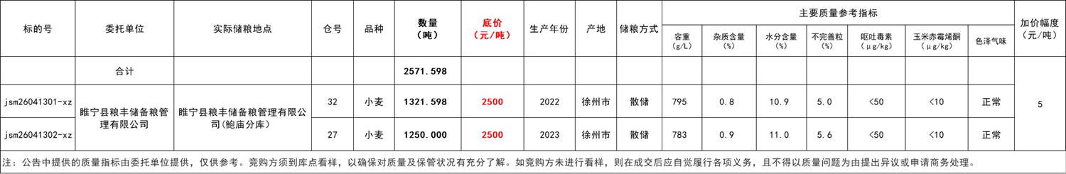數(shù)量:2571.598 噸,分兩個(gè)標(biāo)段,其中,2022年產(chǎn)小麥1321.598噸,2023年產(chǎn)小麥1250噸。(詳見(jiàn)交易清單)